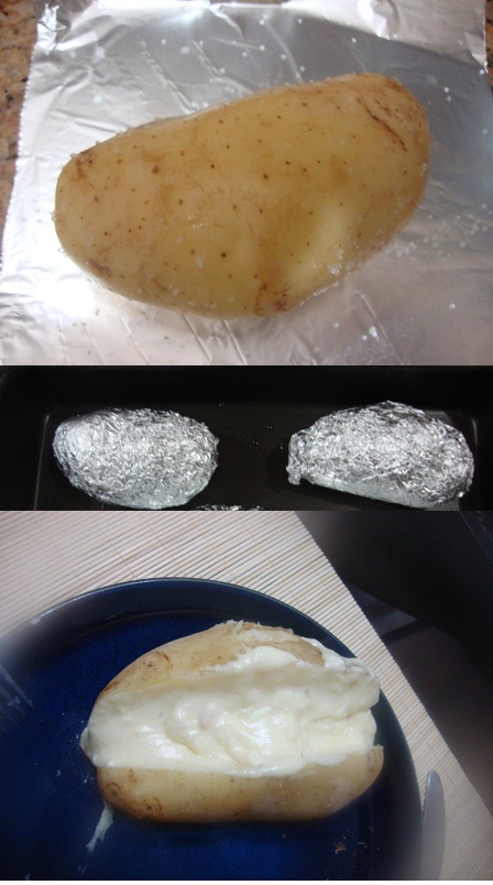 Lave bem as batatas e tempere-as com sal grosso sem tirar a casca. Embrulhe-as em papel alumínio (lado brilhoso para dentro) e leve ao forno médio(200ºC) por 30 minutos. Quando as batatas estiverem macias retire-as do papel alumínio e corte-as ao meio e recheie.