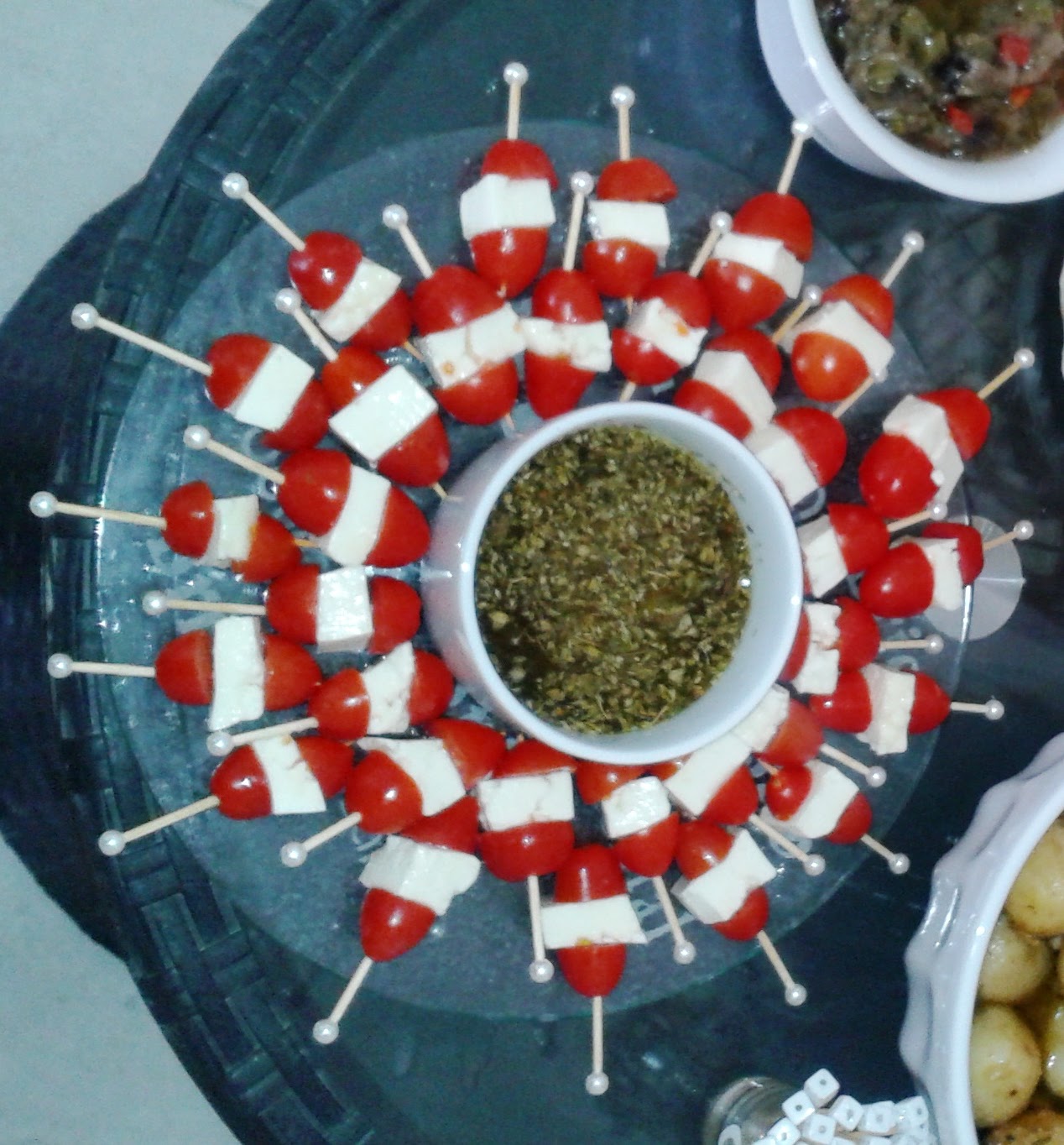 Corte o queijo minas em cubinhos e monte com os tomates na seguinte ordem: tomate queijo tomate prendendo com o palito decorado.