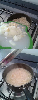 Em uma panela refogue a cebola e depois o alho no óleo, acrescente o arroz mexendo sempre. Junte a água fervente e coloque sal.