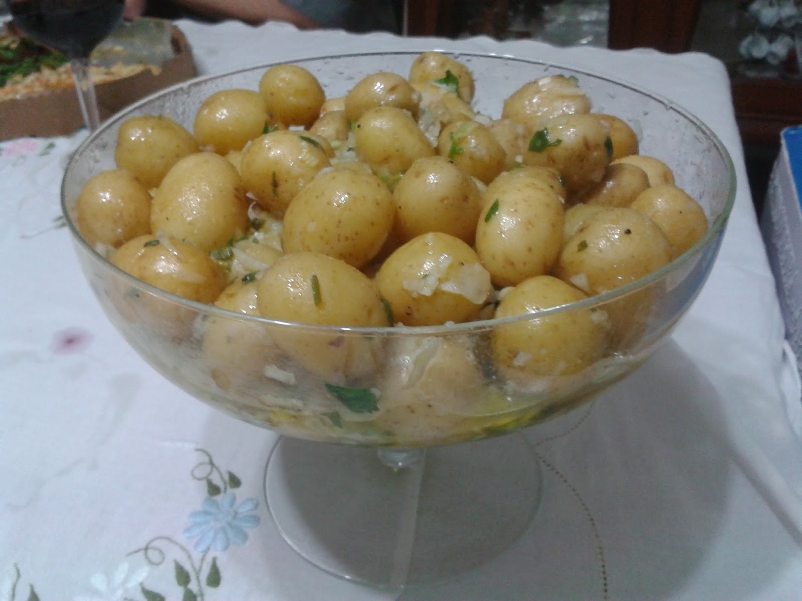 Lave bem as batatinhas com casca em água corrente e cozinhe as batatas na água com sal. Escorra a água e reserve.
