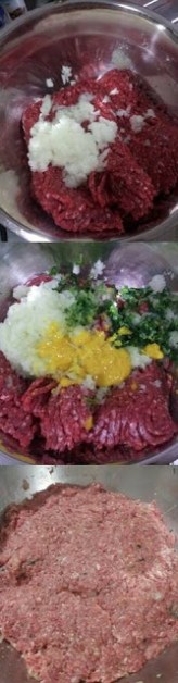 Passe a cebola no processador, acrescente à carne moída e aos demais ingredientes, mexendo com as mãos até pegar consistência.