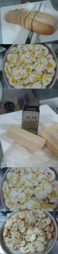 Com uma faca bem afiada corte o pão em rodelas finas de 0,5cm a 1 cm, disponha sobre uma assadeira, de forma que não fiquem muito em cima uma das outras.