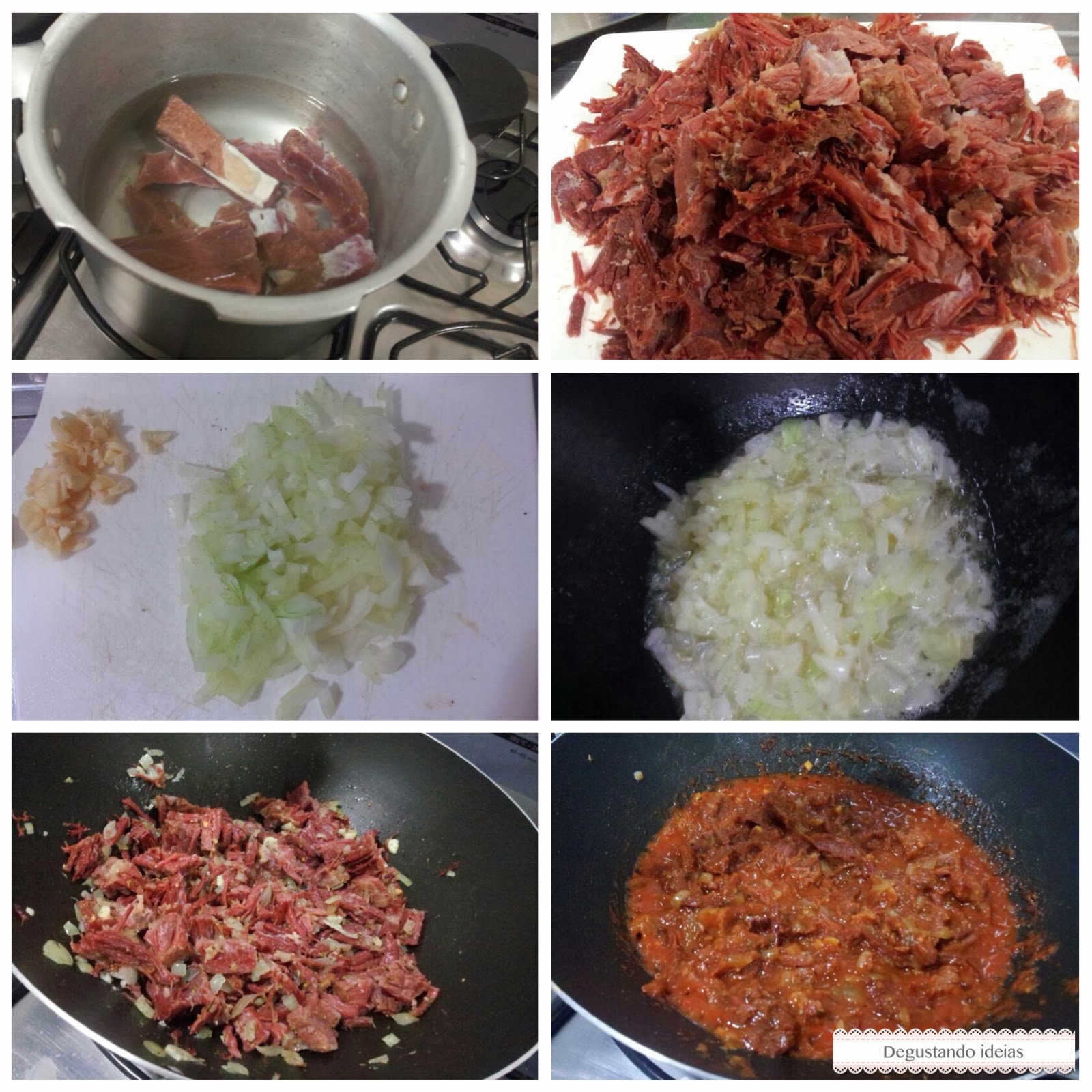 Limpe a carne seca e corte em cubinhos, coloque para cozinhar na panela de pressão por 40 minutos para que a mesma fique bem macia.