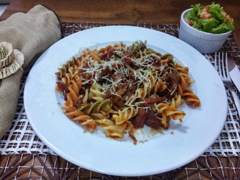 Escorra o macarrão disponha em um recipiente e coloque a carne por cima, sirva puro ou com salada verde.