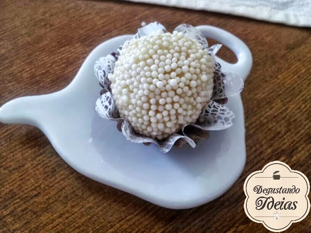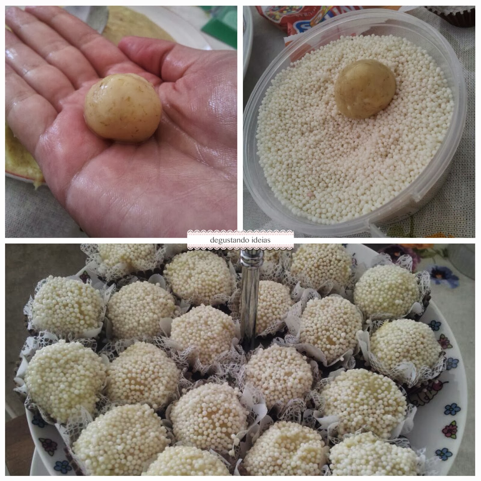 Com as mãos untadas de manteiga faça a bolinha, passe no confeito e coloque em forminhas de papel.