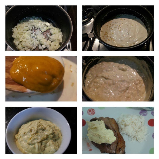 Refogue a cebola bem picada no azeite, acrescente a caixa de creme de leite, uma colher de mostarda, 4 colheres de queijo gorgonzola picado e 3 colheres de queijo tipo catupiry, mexendo bem até engrossar. Coloque sal e pimenta à gosto. Gosto de servir com carne, mas ele fica tão bom que dá para comer até com torrada de aperitivo!