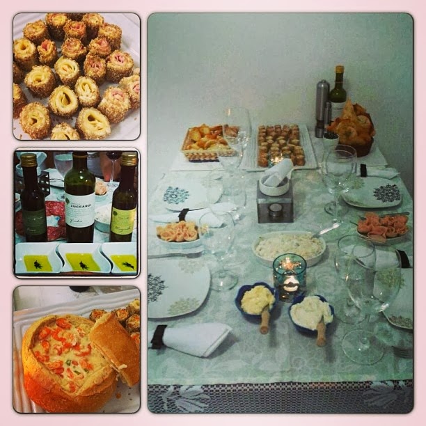 Resolvi fazer um menu mais descontraído, com vários aperitivos e dispensei o prato principal, o que eu preparei para o dia foi:
