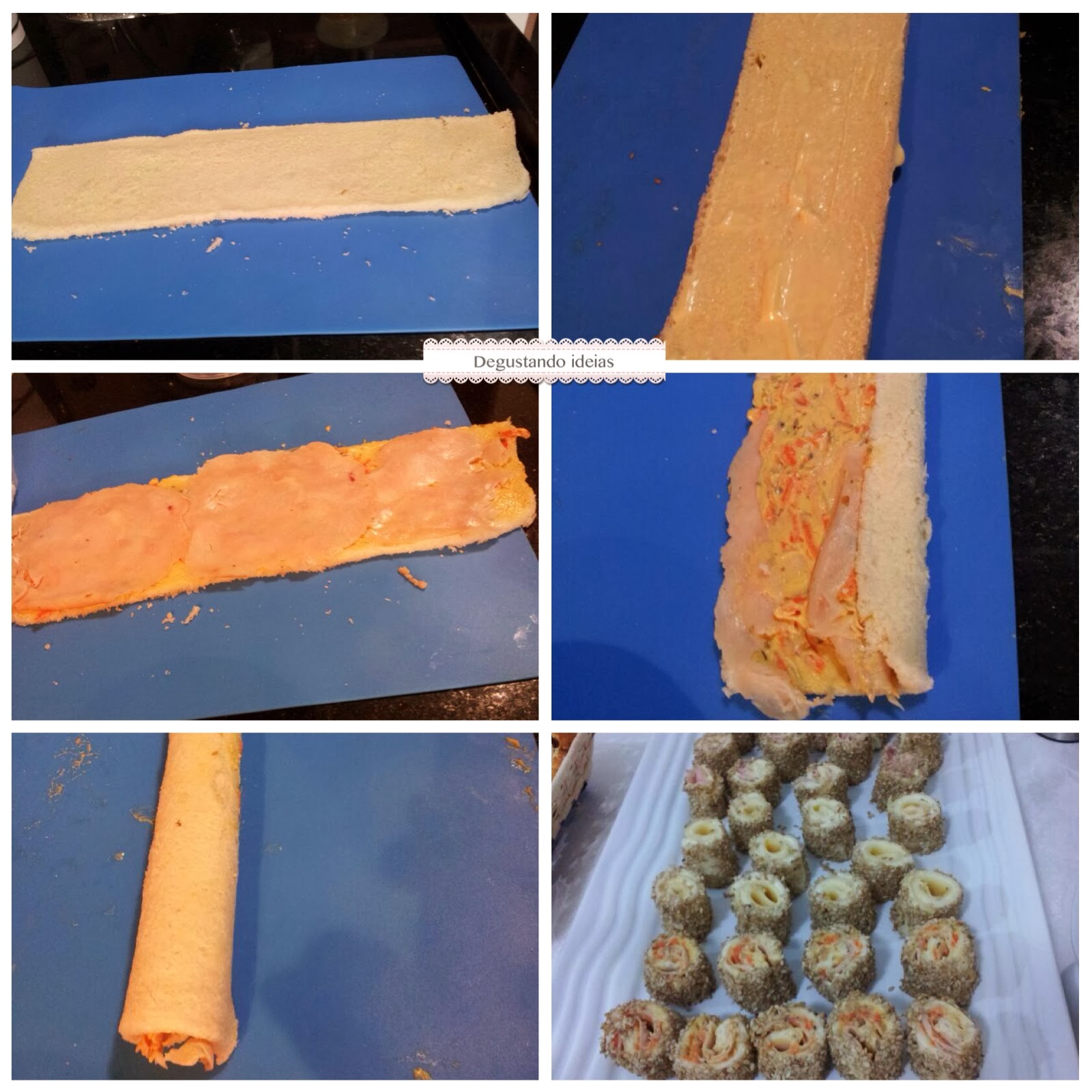 Na parte que ficará dentro passe uma pasta de sua preferência, essa da foto é a de ricota com cenoura que eu dei a receita aqui , coloque o peito de peru, ou frio de sua preferencia, passe mais um pouco da pasta por cima e enrole com a ajuda do papel filme.