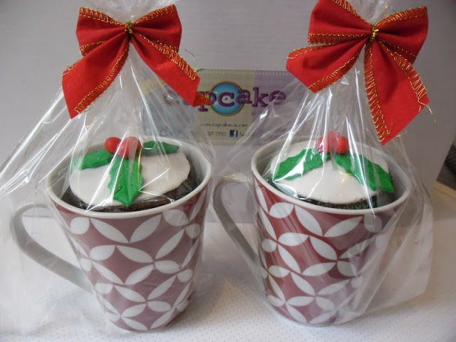 Essa é minha opção favorita, já presenteie muito assim, cupcake dentro da caneca. Adoro caneca então para mim nunca é demais, compre uma bem bonita que o presenteado possa utilizar depois, nesse caso não aconselho comprar de tema natalino.