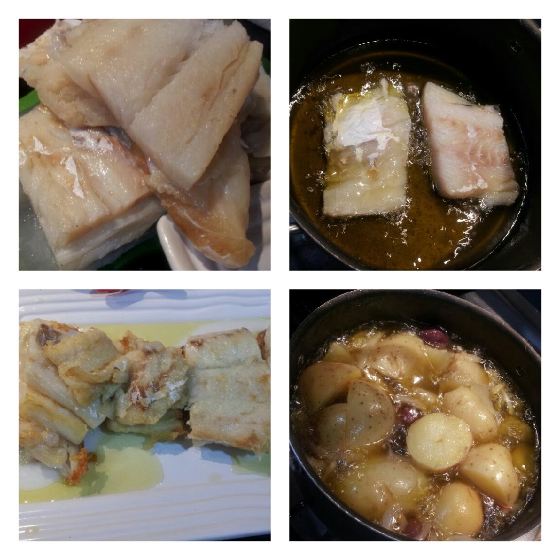 Esquente 250ml de azeite em uma panela anti aderente, retire a pele do bacalhau e coloque-o no azeite quente, sempre mantendo o fogo baixo.