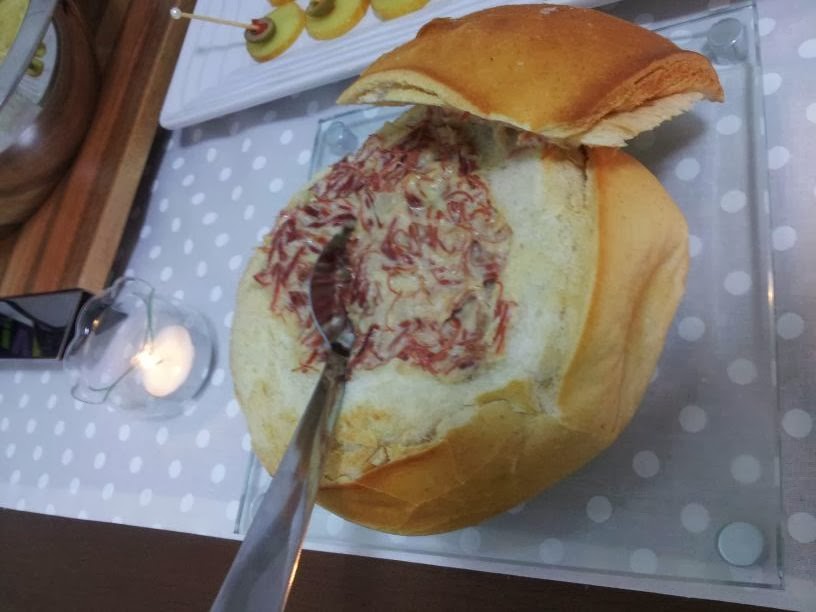 Corte a tampa do pão italiano e retire todo o miolo reservando-o. Encha o pão com o creme feche-o enrolando-o no papel alumínio, sempre com lado brilhoso para dentro. Leve ao forno por 10 minutos.