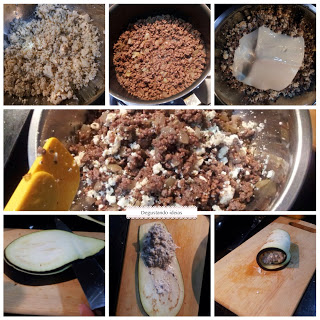 Corte a berinjela na horizontal, coloque um pouco da mistura de carne sobre ela e enrole.