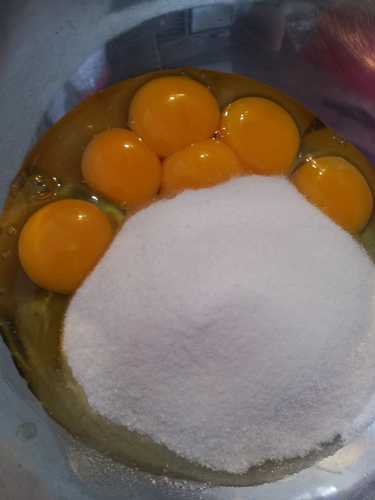 Bata os ovos (gemas e ovo inteiro) com o açúcar, com a ajuda de um fouet .