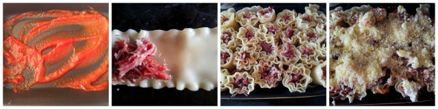 Primeiro prepare a carne como eu ensinei aqui, depois pegue punhadinhos da carne já desfiada e refogada na com a cebola e enrole na massa. Faça uma caminha de metade da massa de tomate em uma assadeira e vá dispondo os rolinhos de carne, faça isso até terminar a massa. Preencha o sache da massa de tomate com água e cubra com o restante os rolinhos, jogue o queijo ralado por cima e leve ao forno à 250ºC por 25 minutos.