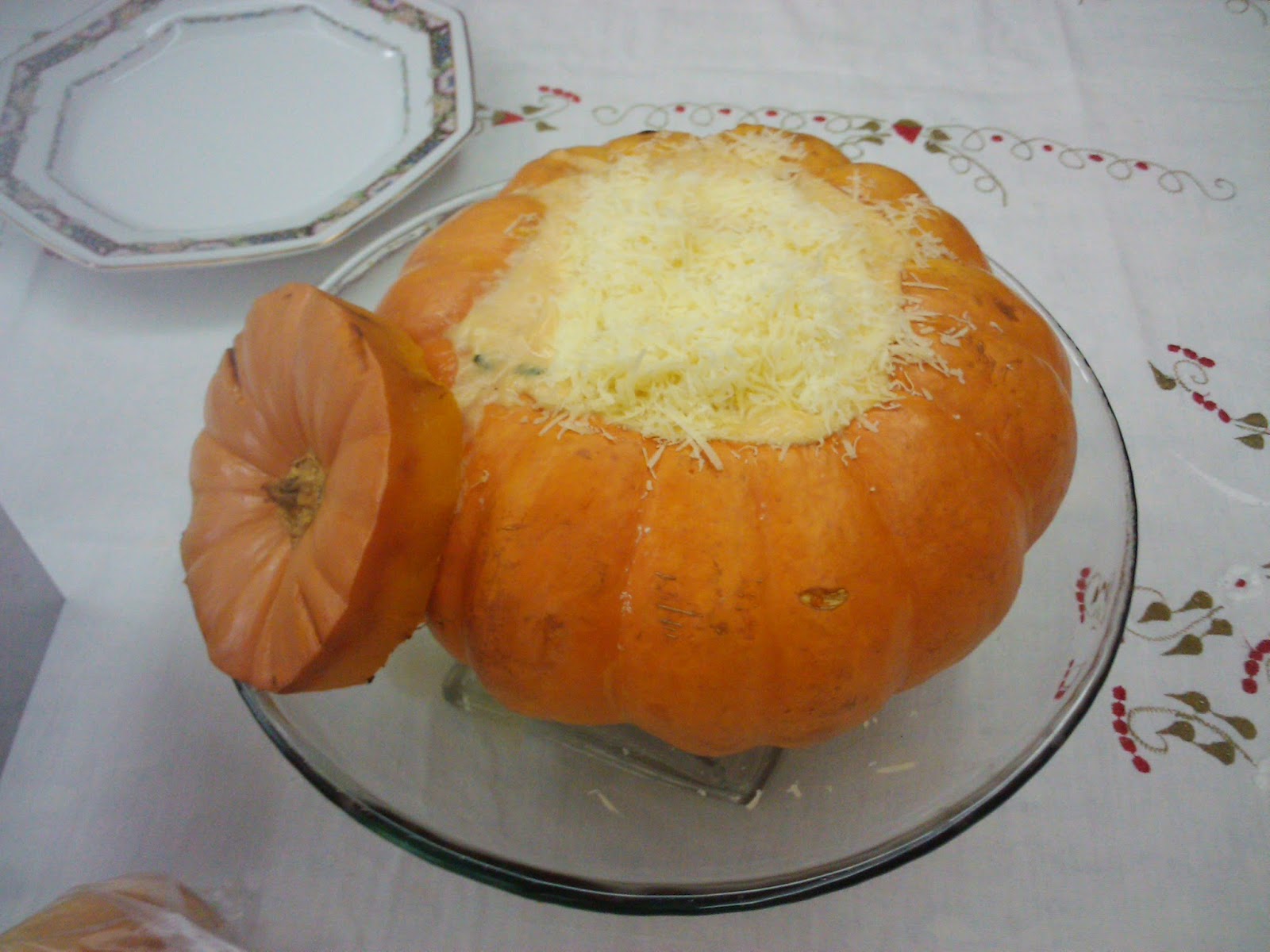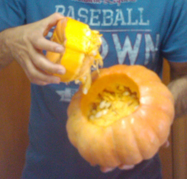 Lave bem a moranga, corte somente a parte do caule e tire as sementes.