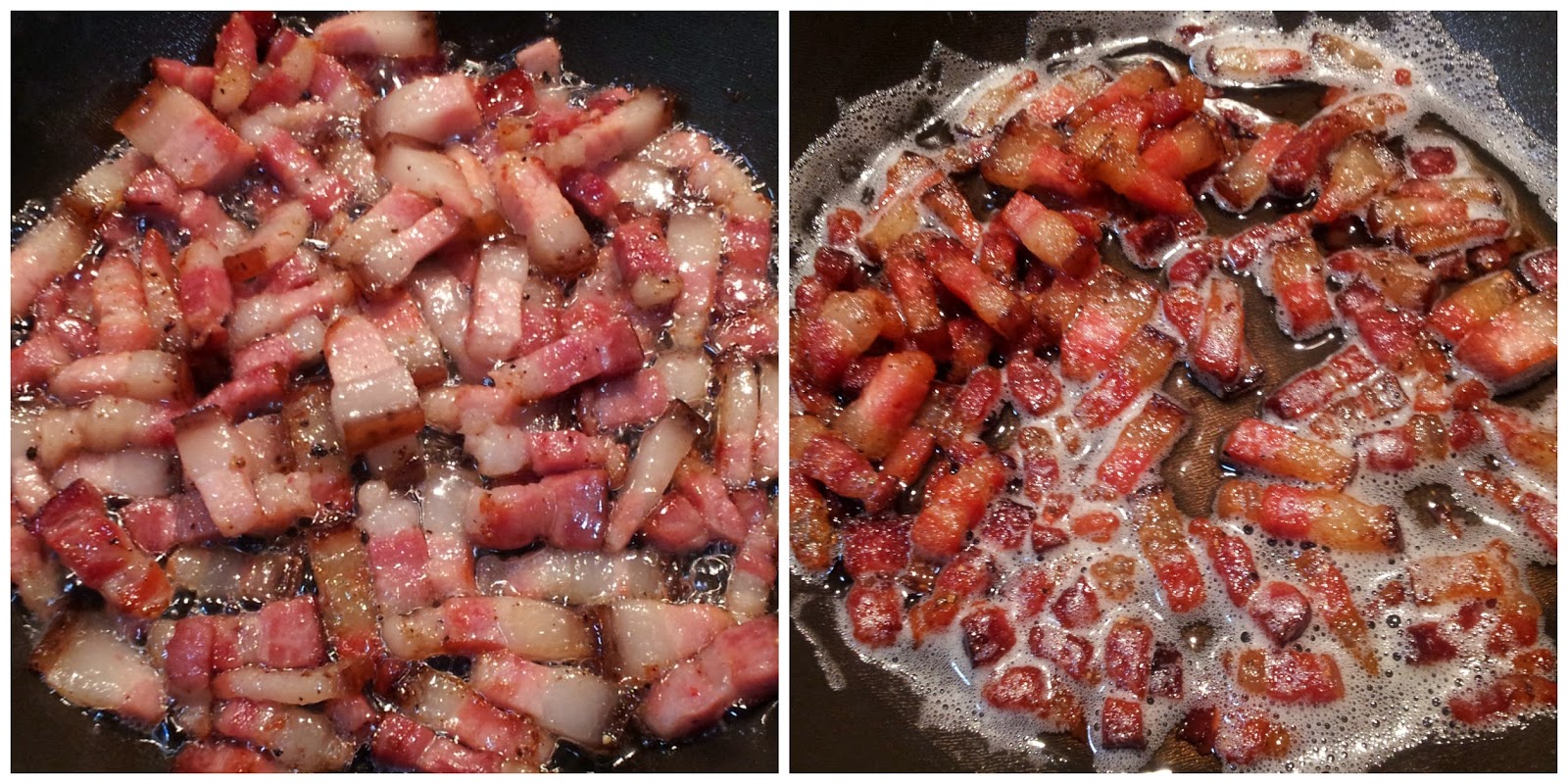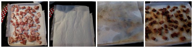 No micro-ondas: coloque o bacon picado em uma travessa forrada com papel toalha e cubra –os também com papel toalha e leve ao micro-ondas por 3 minutos em potencia alta.