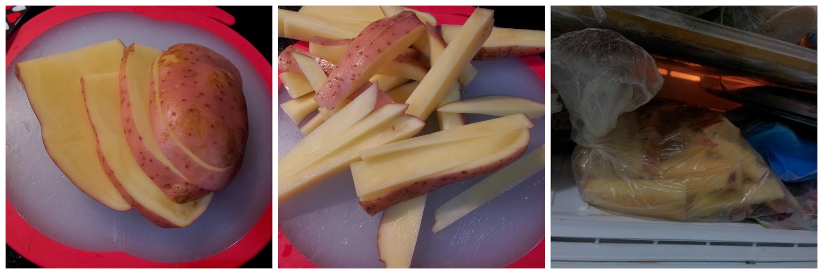 Depois de lavar bem, corte as batatas na vertical e depois na horizontal, como na foto abaixo, para fazer os palitos, sem tirar a casca, coloque em um saco plástico salpique com a pimenta e leve ao freezer enquanto prepara o resto da receita.
