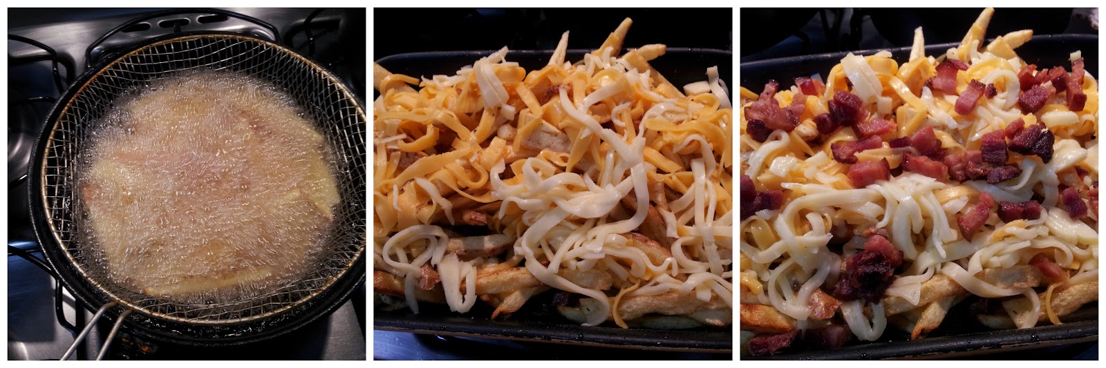 Monte em um refratário na sequência: batata frita, queijos e bacon.