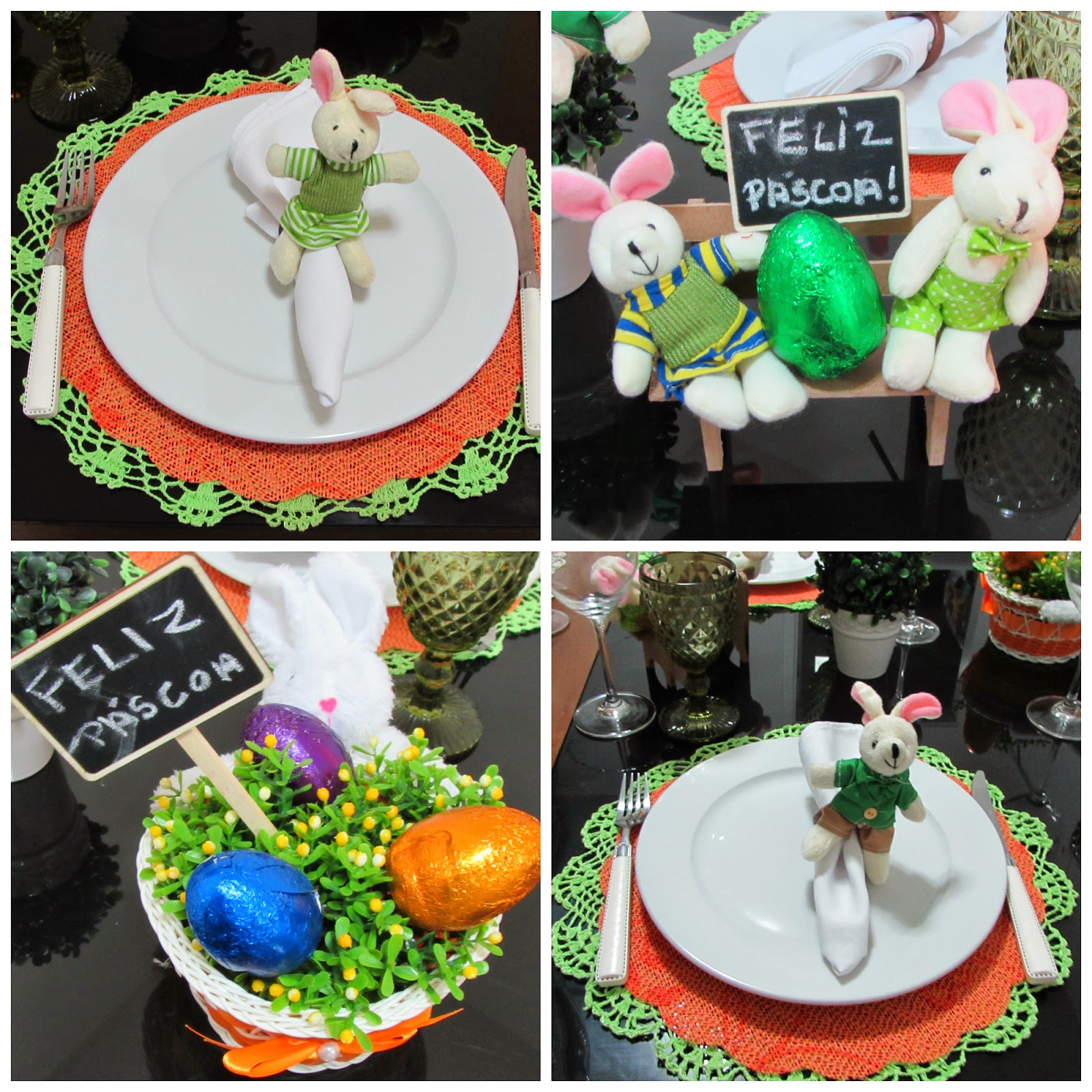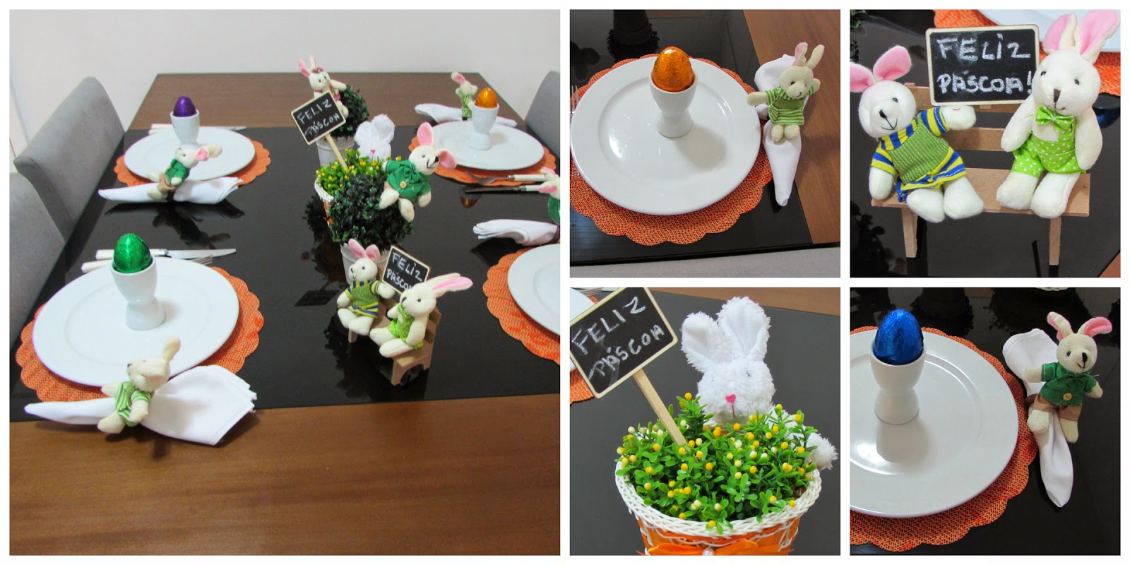 Eu fiz duas versões da mesa a primeira usei um jogo americano laranja que comprei na loja Amigão por uma pechincha, usei meus porta ovos para colocar os ovos de chocolate que comprei nas Lojas americanas, os prendedores de guardanapo fui eu quem fiz, super fácil e ensino como fazer nesse post aqui que vai ao ar amanhã e são bem fáceis de fazer.