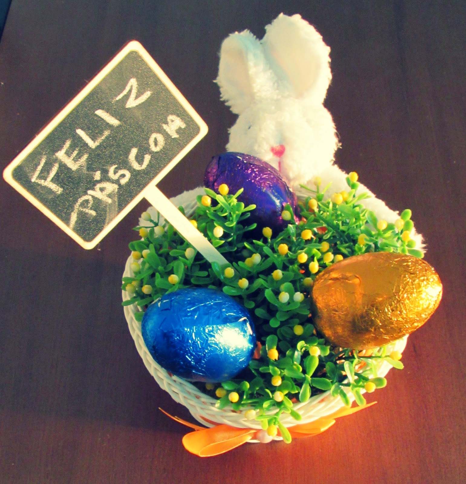 A cestinha de coelho também é da loja Amigão, que enchi com flor artificial e ovinhos de chocolate que comprei nas Lojas Americanas, as plaquinhas eu já tinhas, mas são bem fáceis de encontrar no Saara.