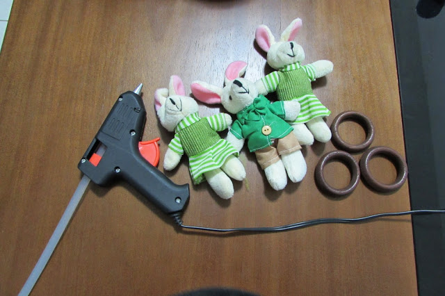 Passe a cola na parte de trás dos coelhos e aperte as argolas contra a cola. Aperte bem para fixar a argola no coelho.