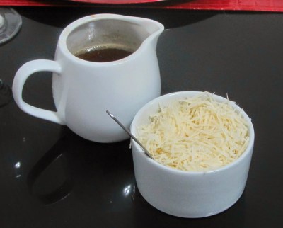 Servi com queijo ralado e manteiga queimada, que é feite de forma bem simples, é só colocar a manteiga em uma panela e deixar em fogo baixo até que ela fique com uma cor dourada.
