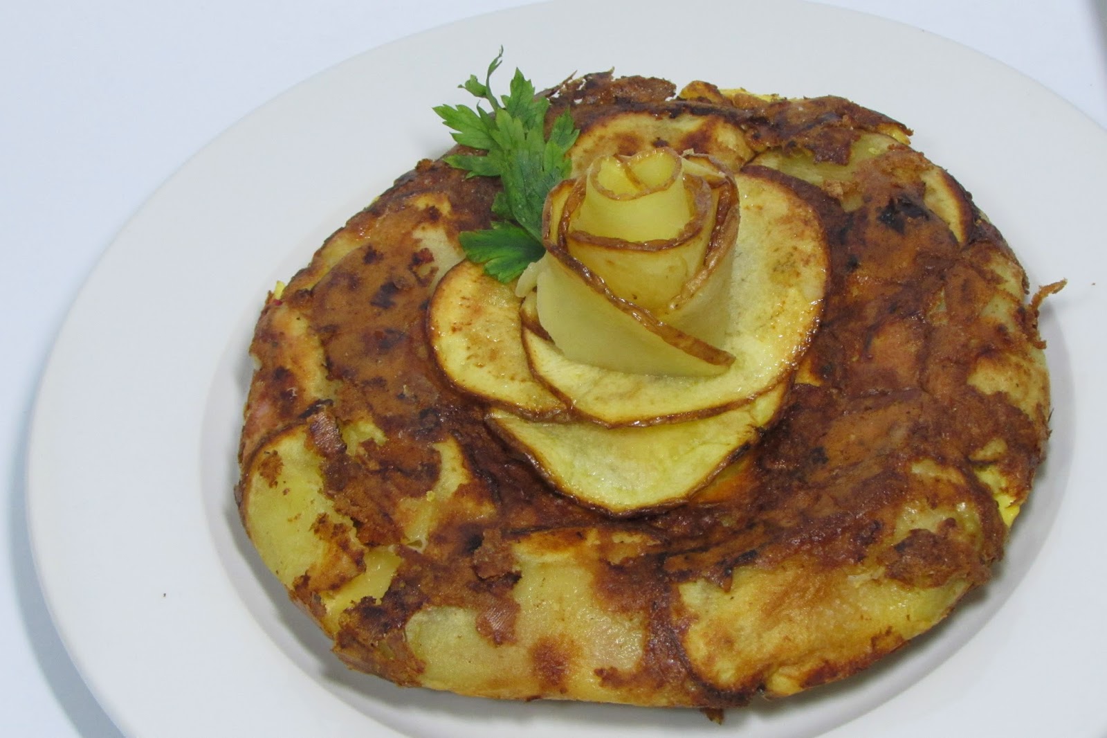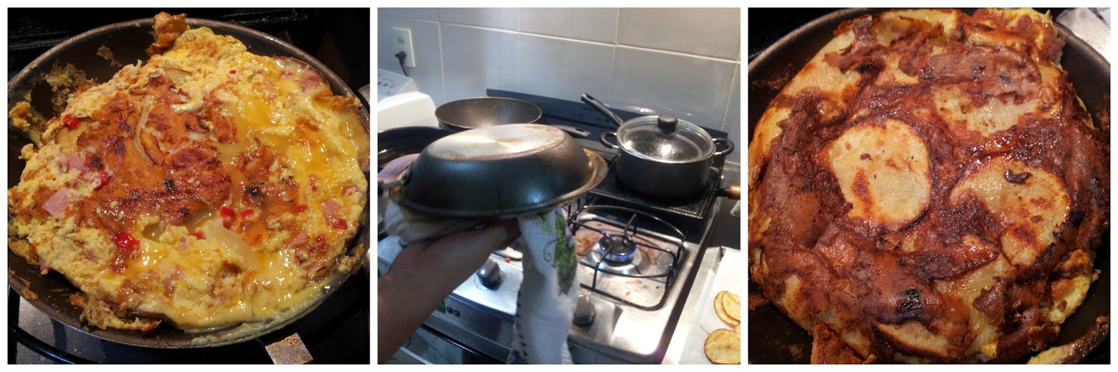 Espere dourar as bordas para virar a fritada. Use a ajuda de um prato para virar a tortilha, vire-a em um prato e depois delicadamente vai escorregando-a de volta para a frigideira com a parte já dourada para cima.