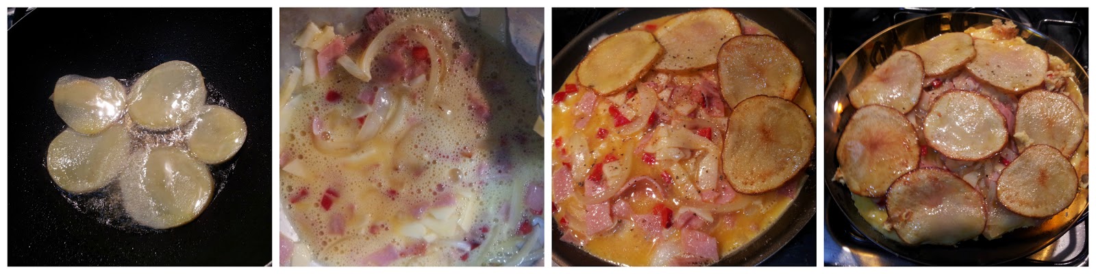Em uma frigideira, monte um pouco de batata, jogue um pouco dos ovos batidos coloque mais batata cubra, jogue mais um pouco dos ovos e finalize com as batatas.