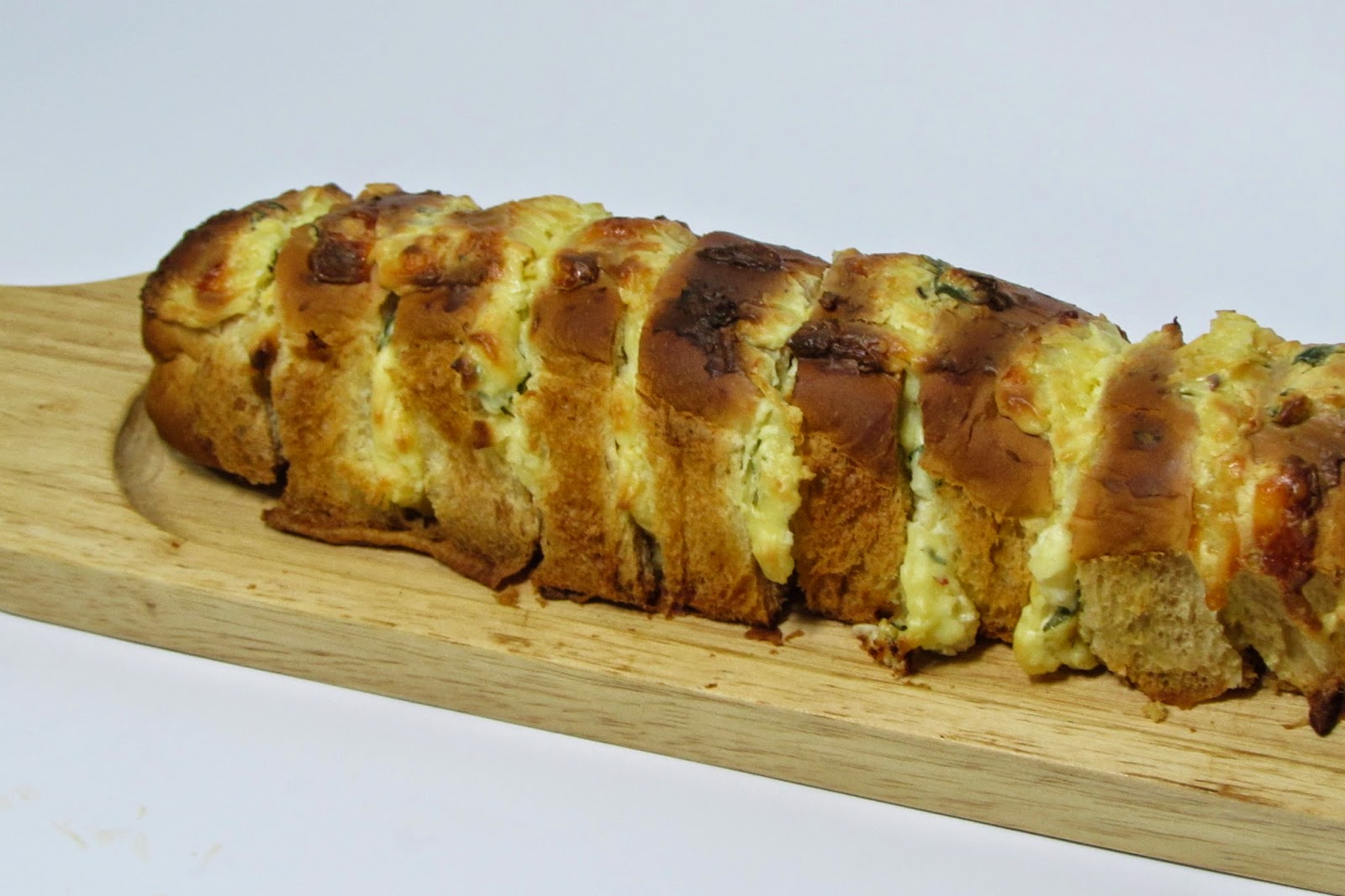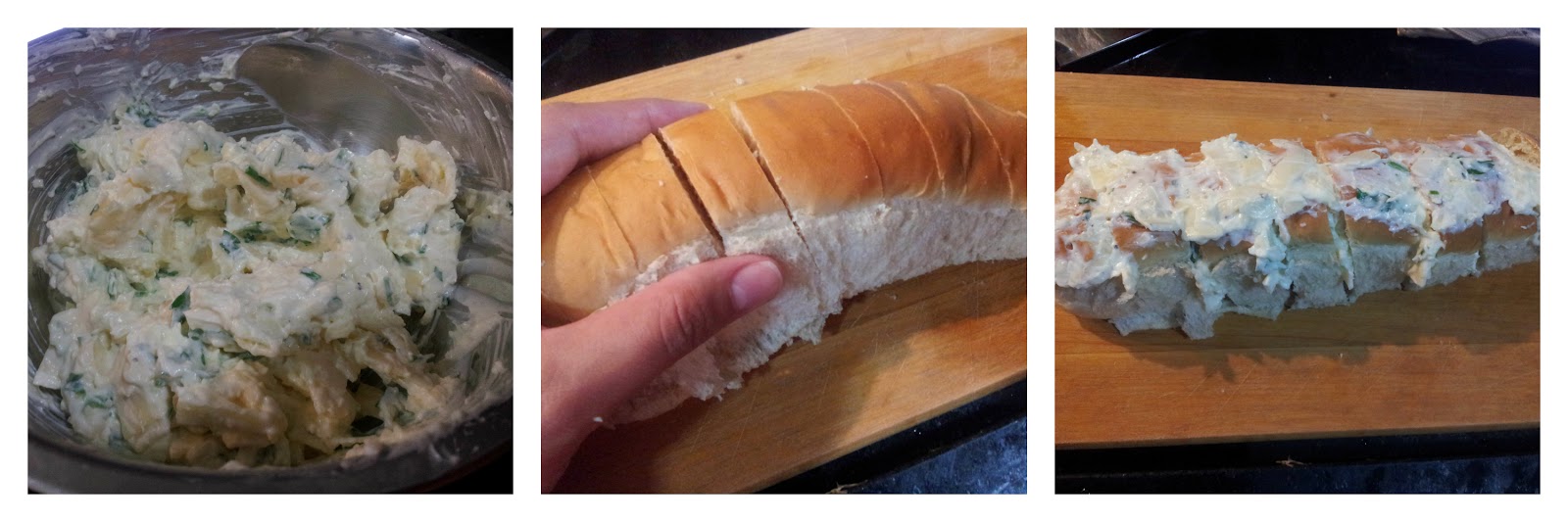 Corte o pão na vertical tomando cuidado para não chegar até a base.Recheie com a mistura de alho e passe parte da mistura também sobre o pão.
