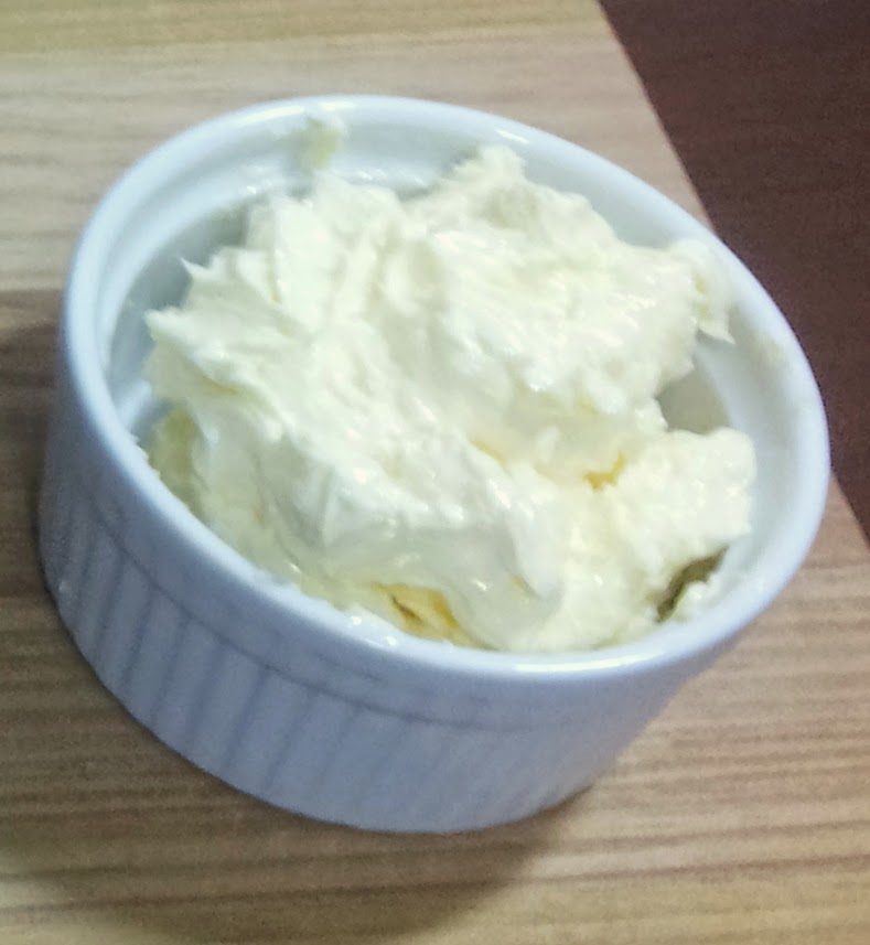 Bata a manteiga em uma batedeira e vá acrescentando a água aos poucos. Quando estiver esbranquiçada e aerada esta pronta.