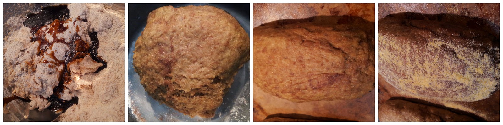 Misture todos as farinhas e o chocolate fazendo um buraco no meio, adicione a água, o melado e a manteiga misturando bem, após adicione o açúcar, o sal e o fermento. Sove bem com as mãos até que a massa esteja bem homogênea.