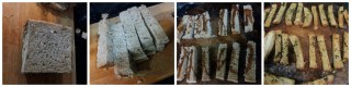 Tire a casca das fatias de pão de forma, e depois corte o pão em tirinhas. jogue a manteiga sobre o pão e leve ao forno pré-aquecido a 200ªC até dourar. Você pode colocar temperos sobre as torradas como orégano, alecrim, sal grosso e até mesmo queijo ralado.