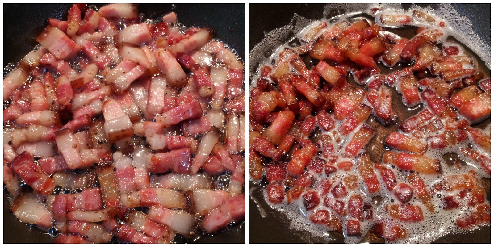 Para fazer o bacon tire sua capa e pique o mesmo, coloque em uma frigideira em fogo baixo e deixe fritar em sua própria gordura.