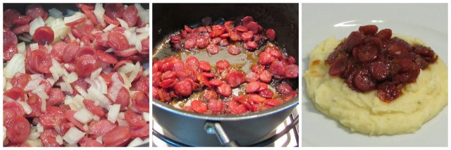 Corte a linguiça em rodelas bem finas, em uma panela doure a linguiça junto com as cebolas, até as ultimas ficarem transparentes.