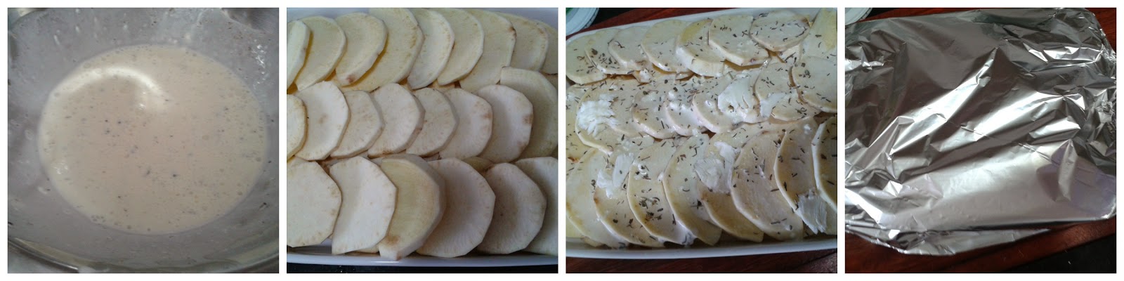 Com a ajuda de um fuet bata todos os ingredientes menos as batatas, em um refratário faça camadas de batata e jogue o creme por cima. Cubra com papel alumínio e leve ao fogo pré aquecido a 200ºC por 1h.