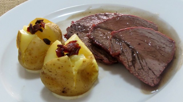 Corte a carne e sirva com as batatas com bacon e o molho sobre a carne.