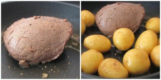 Sele a carne no azeite em uma frigideira bem quente, salgue a carne depois de selada, coloque a batata no mesmo refratário que a carne e leve ao fogo pré-aquecido à 200ºC por 50 minutos.