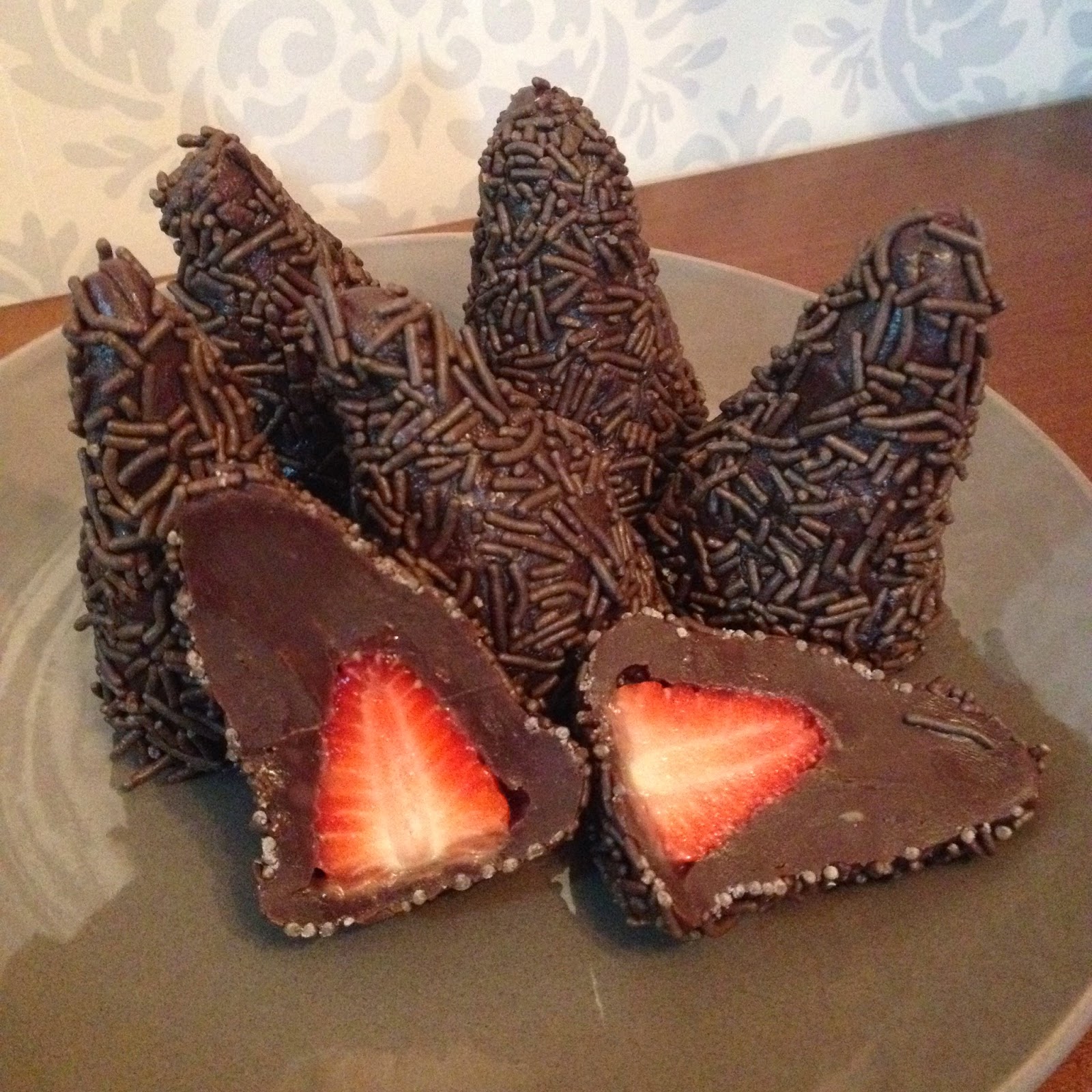 Meu morangos estavam pequenos o ideal é usar grandes para ocupar todo interior da “coxinha”, mas assim como na coxinha verdadeira a parte que eu continuo gostando mais ainda é a “massa” e não o recheio! 😉