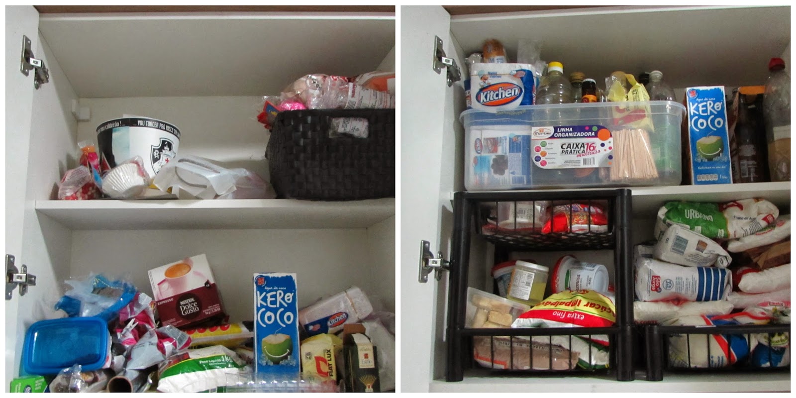 Segue as fotos do antes e depois da minha despensa, e vejam como faz diferença ela estar organizada, até mesmo para agilizar seu dia na hora de preparar as refeições.