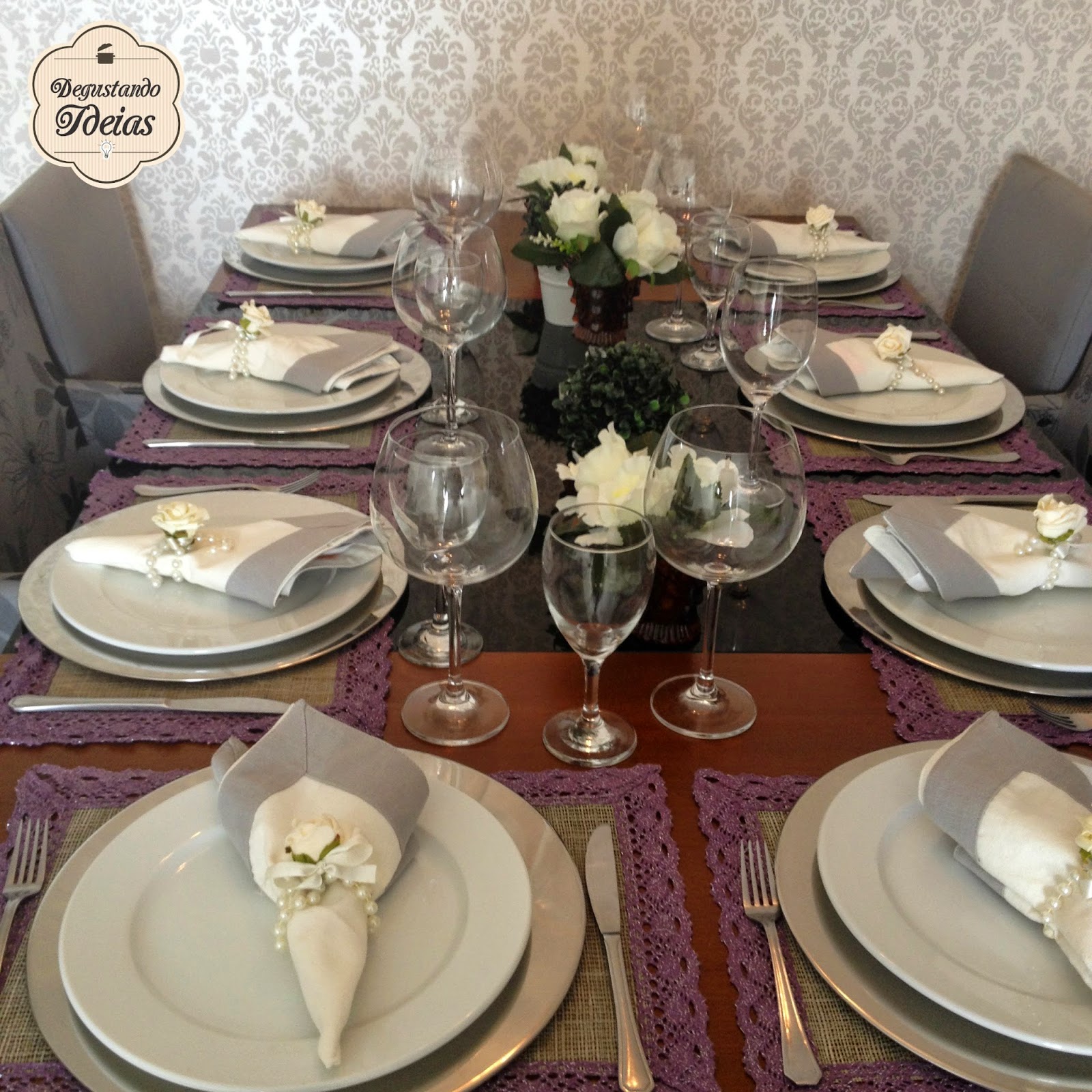 Usei jogo americano ao invés de toalha o que já deixa a mesa mais leve, porém incrementei com os sousplat prateados, os guardanapos de tecido com o prendedor de pérolas, copos de vinho e de água e claro os talheres, dando um toque refinado à mesa.