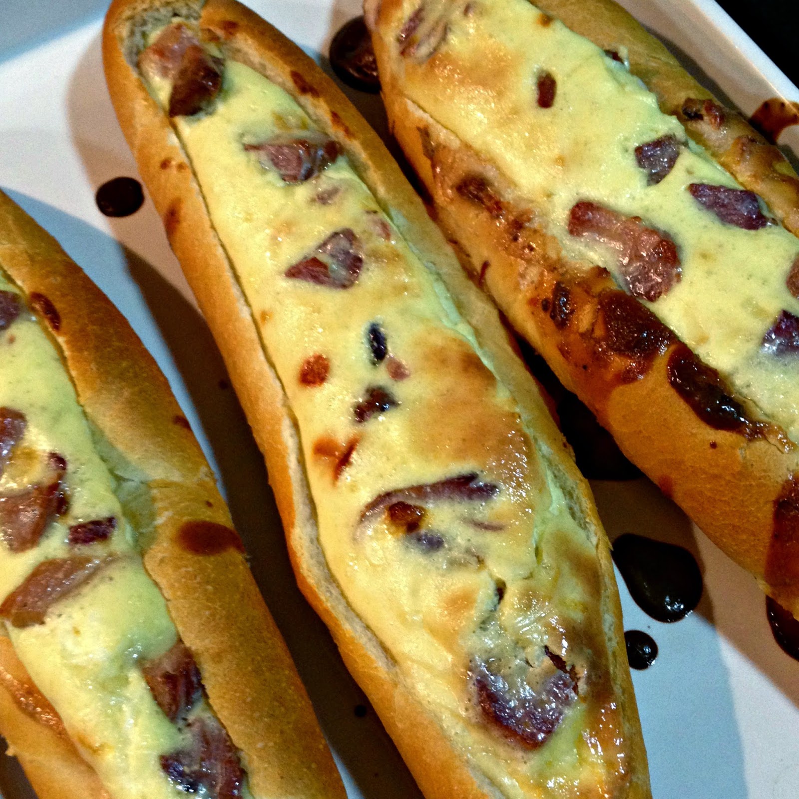 Bata os ovos como se fosse fazer uma omelete, acrescente todos os ingredientes. Disponha as baguetes em uma assadeira e preencha as mesmas com as mistura de ovos.