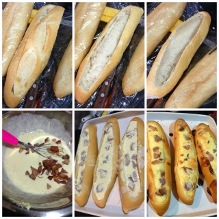 Bata os ovos como se fosse fazer uma omelete, acrescente todos os ingredientes. Disponha as baguetes em uma assadeira e preencha as mesmas com as mistura de ovos.