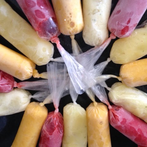 Bata tudo no liquidificador, e com a ajuda de um funil encha os saquinhos de sacolé, dê um nó e leve ao freezer até endurecer.