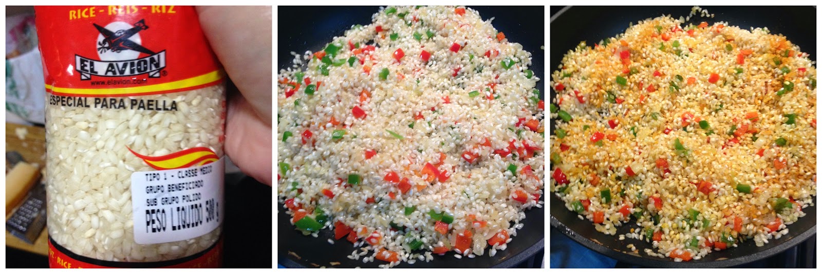 Em uma panela estilo Paella aqueça o azeite e refogue a cebola e o pimentão, acrescente o arroz e após o vinho e a páprica e o açafrão. Enquanto isso coloque o caldo para esquentar.