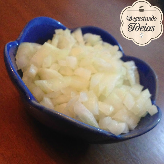 Eu aprendi a cortar cebola assim pequenininha no curso, ela tem um nome difícil, se chama brunoise mas não é tão complicada assim de fazer, olha só.