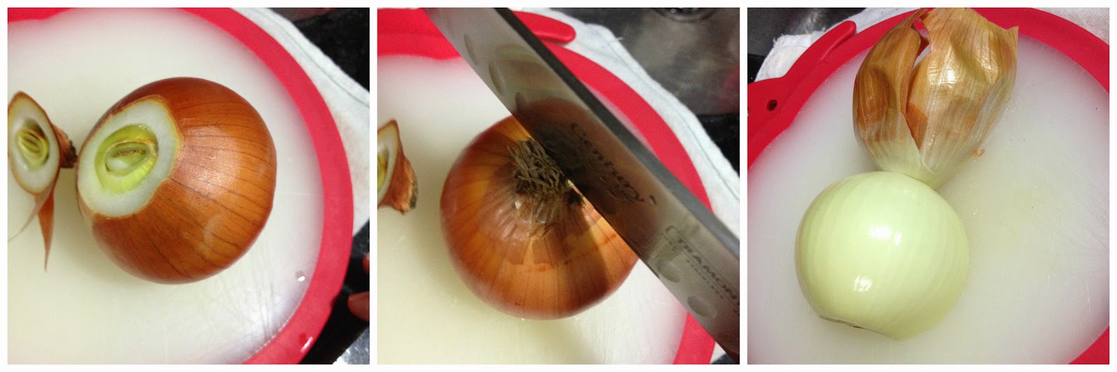 Vire a casca da cebola ao contrario de modo que fique presa como na foto, assim fica mais fácil cortar bem fininha, pois assim ela fica mais firme e não escorrega na hora de cortar.