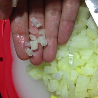 Pronto você tem pedacinhos de cebola cortados a brunnoise o corte mais tradicional da gastronomia.