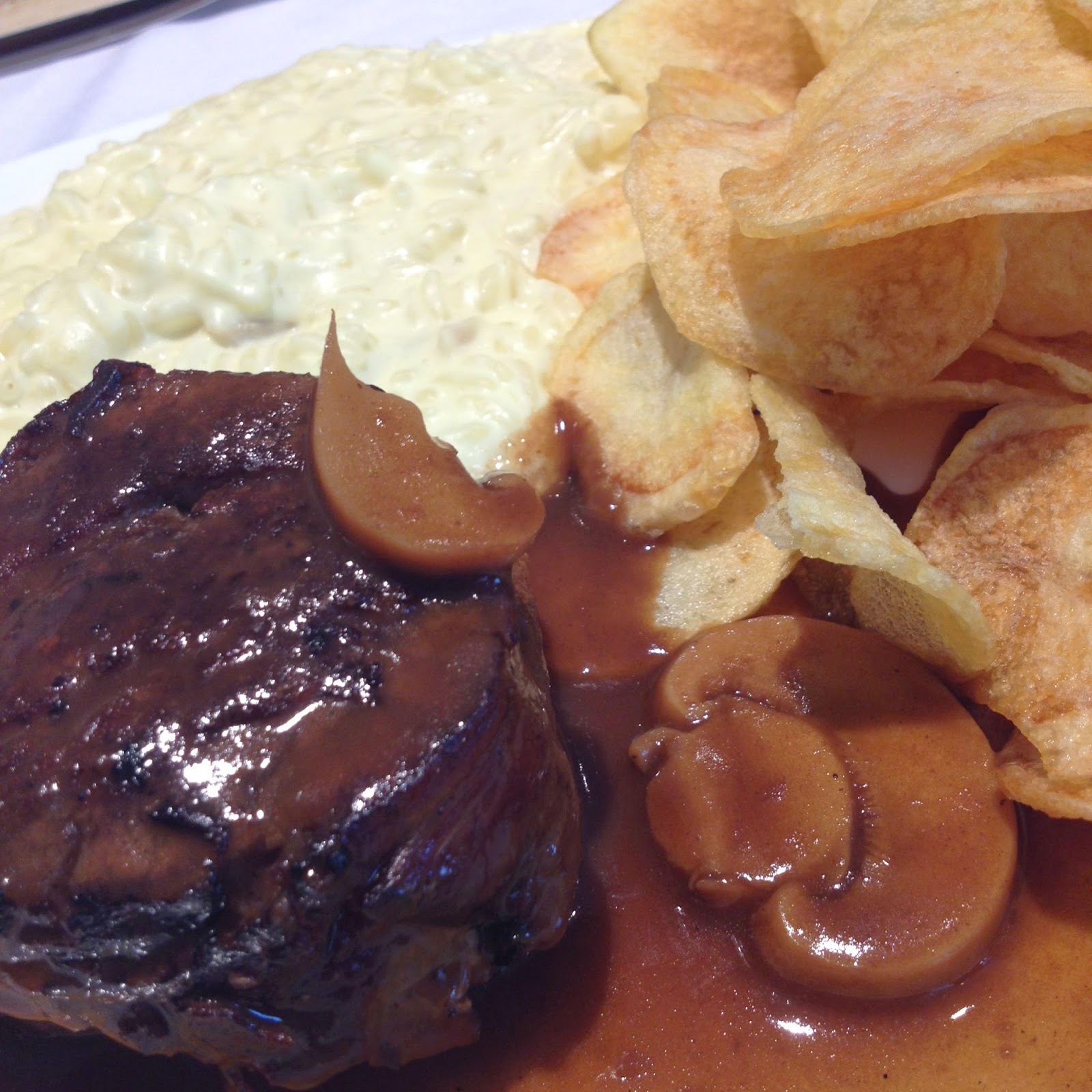 O outro prato foi o Steak au poivre, que consiste em um corte de carne com molho de pimenta acompanhado de batata noisette e arroz branco. A carne estava no ponto e o molho é delicioso, particularmente achei melhor que o do medalhão mais saboroso, e como a pimenta não queima só dar sabor mesmo quem nau curte comida apimentada vai gostar.