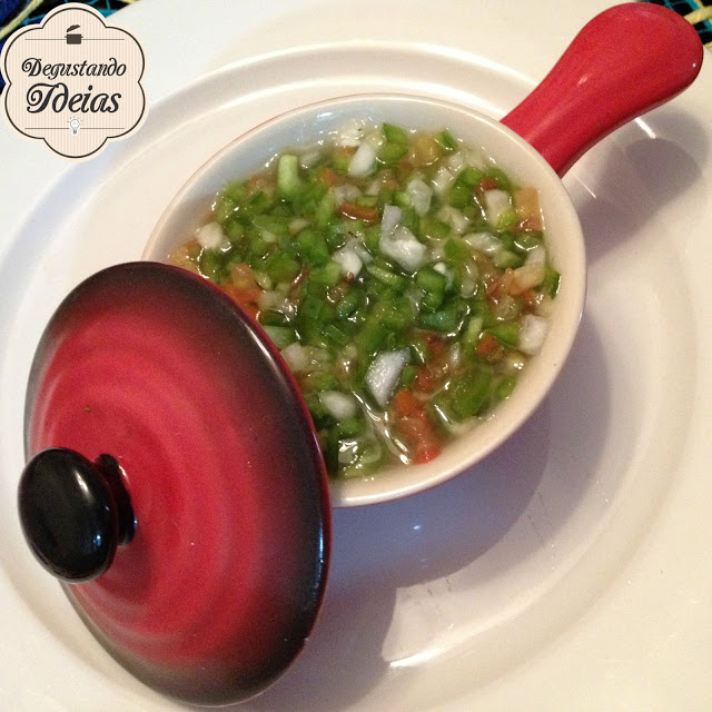 Pique bem pequeno a cebola, o tomate e o pimentão, misture tudo e acrescente o suco de 2 limões, o vinagre, o sal e a pimenta. Reserve, quanto mais tempo o molho ficar “curtindo” melhor, então se possível faça no dia antes de usar.