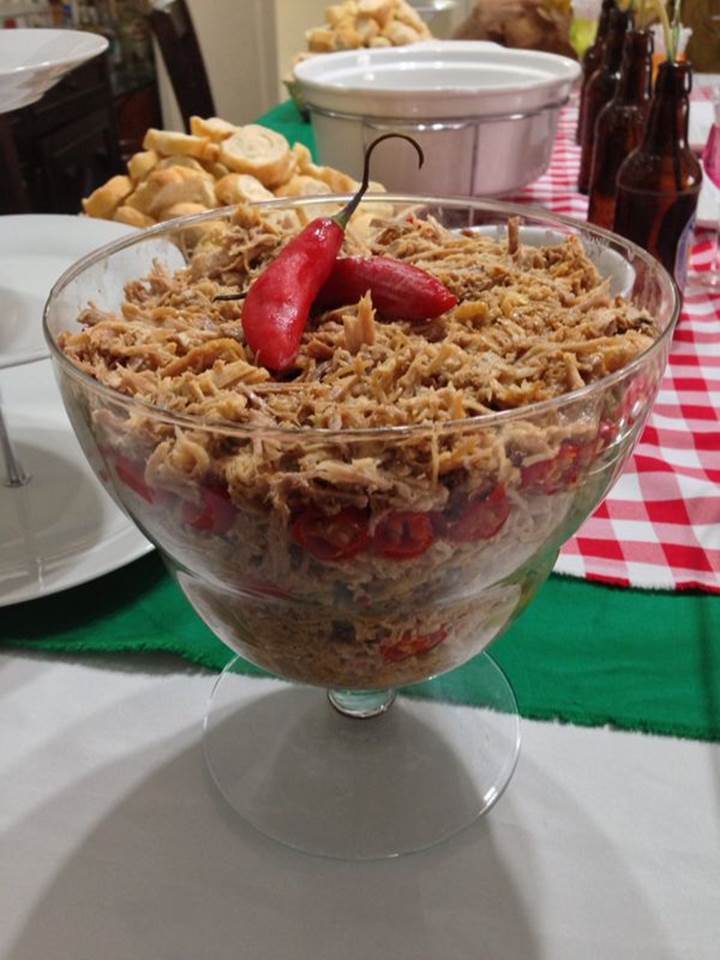No fundo da taça, coloque 1 colher (sopa) de alho frito, um punhado de lagarto cozido e desfiado, 1 colher (sopa) de alho frito, uma camada de alcaparra processadas com azeitonas verdes sem caroço, uma camada de salsinha picada, rodelas de pimenta dedo-de-moça, 1 filé de aliche cortado. Vá repetindo as camadas, terminando com salsinha picada e azeite a gosto. Regue tudo com bastante azeite.